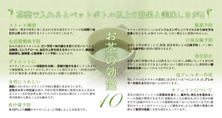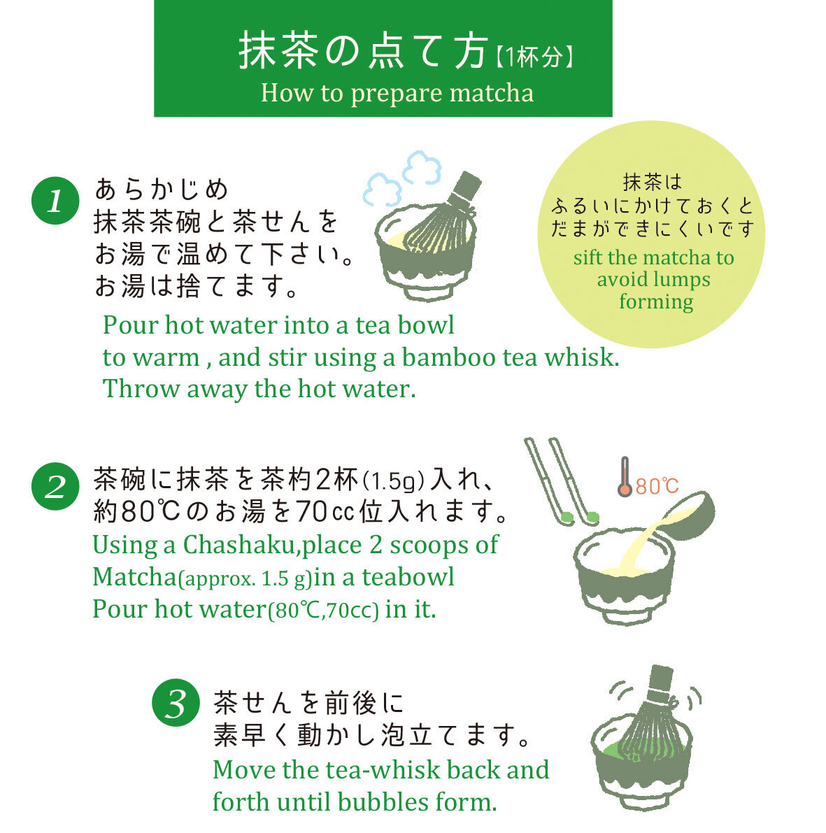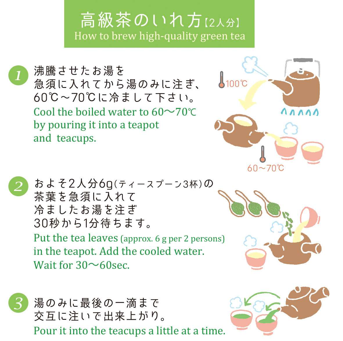 <お茶の効能> <美味しいお茶のいれ方> ・高級茶 How to brew high-quality green tea ・水出し茶 How to make tea with cold water ・抹茶の点て方 How to prepare matcha ページトップへ